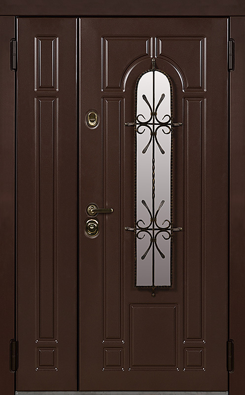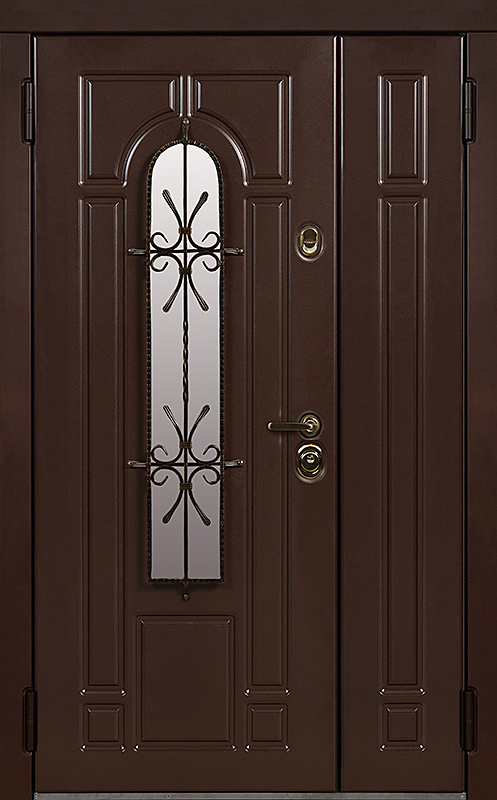 Эта металлическая двухстворчатая дверь с арочным стеклопакетом №15 представляет собой идеальный баланс между эстетикой и прочностью. Арочное стекло добавляет в её дизайн утончённость, а ковка в декоре придаёт изысканный, но в то же время крепкий и надёжный вид. Плита МДФ, используемая как для внешней, так и для внутренней отделки, не только сохраняет прекрасный внешний вид, но и устойчива к механическим повреждениям. Металлическая двухстворчатая дверь с арочным стеклопакетом №15 от производителя: быстрое изготовление и монтаж в Киржаче, индивидуальные размеры, широкий выбор материалов и фурнитуры, официальная гарантия до 10 лет.