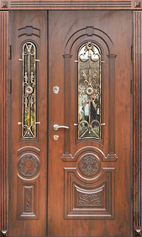 Входная металлическая дверь для частного дома со стеклом и ковкой №29