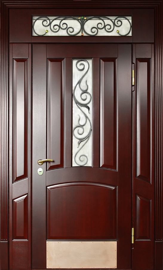 Красивая шпонированная дверь с надежной фурнитурой и ковкой "лоза" №33 идеально дополнит интерьер вашего частного дома или коттеджа. Внешняя и внутренняя отделка выполнены из натурального дерева, что придает двери элегантность и стиль. Профильная труба 50х25 мм используется для каркаса и полотна, а лист металла толщиной 2 мм и ребра жесткости из профильных труб 40х25 мм обеспечивают прочность и долговечность. Несмотря на отсутствие терморазрыва, дверь гарантирует надежную защиту и теплоизоляцию благодаря двум контурам уплотнения. Элементы ковки "лоза" придают двери особое очарование, сочетая практичность с эстетикой. Эта дверь — идеальный выбор для тех, кто ценит стиль, качество и безопасность. Красивая шпонированная дверь с надежной фурнитурой и ковкой "лоза" №33 от производителя: быстрое изготовление и монтаж в Киржаче, индивидуальные размеры, широкий выбор материалов и фурнитуры, официальная гарантия до 10 лет.